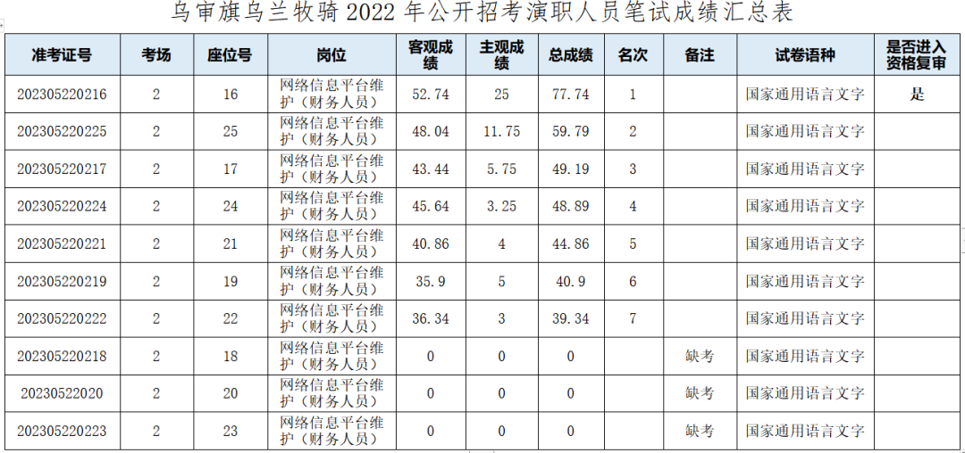 按照《乌审旗乌兰牧骑2022年公开招考演职人员公告》要求,经公开招考演职人员领导小组研究,现就笔试总成绩、资格复审及体检事宜公告如下:
