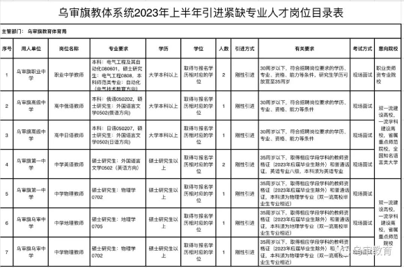 本次人才引进共设7个岗位,计划面向社会公开引进紧缺人才9名。具体信息和要求详见《乌审旗教体系统2023年上半年引进紧缺专业人才岗位目录表》。