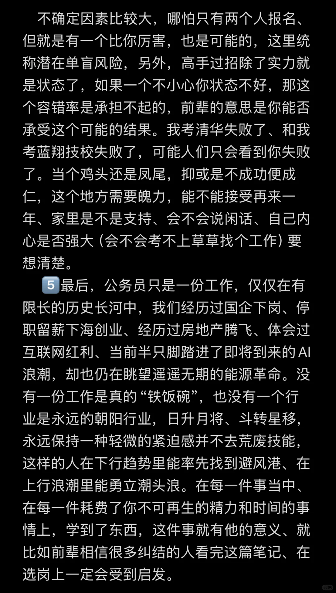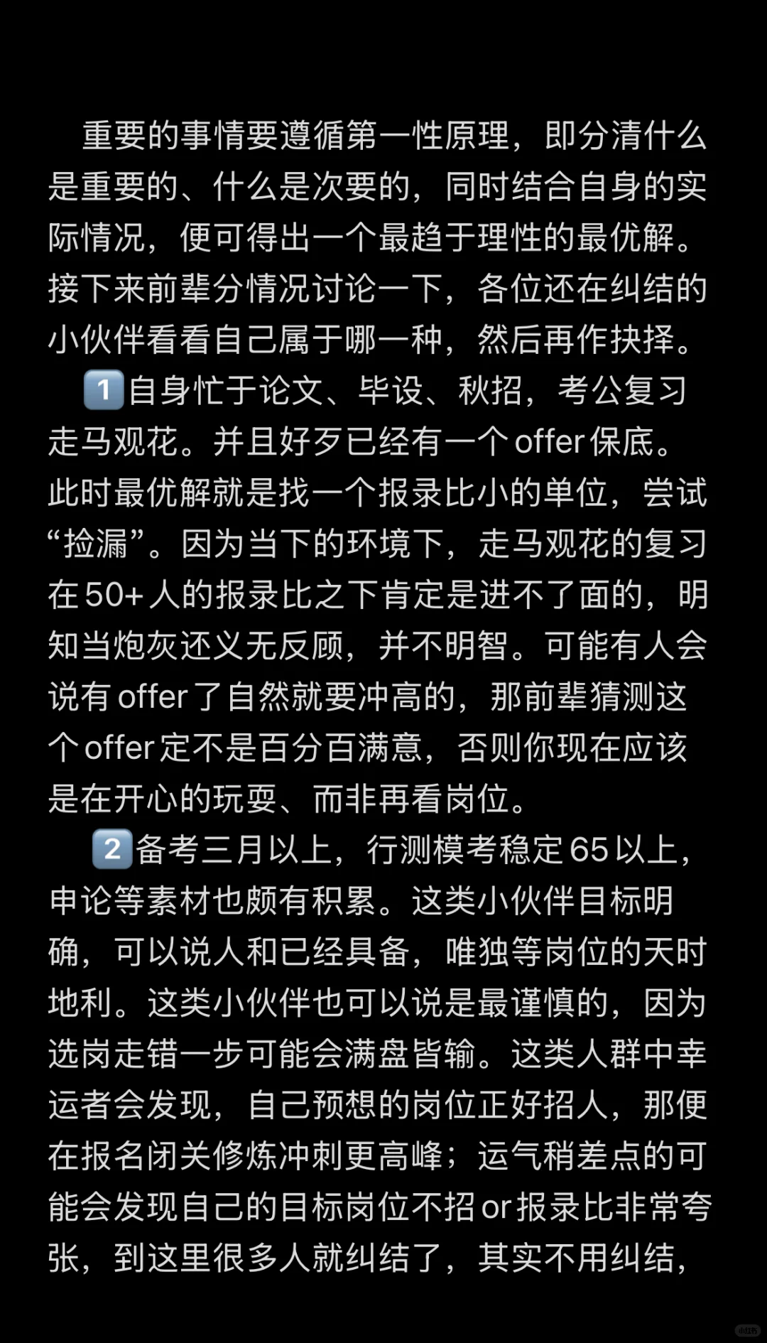 1️⃣自身忙于论文、毕设、秋招,考公复习走马观花。并且好歹已经有一个offer保底。此时最优解就是找一个报录比小的单位,尝试“捡漏”。因为当下的环境下,走马观花的复习在50+人的报录比之下肯定是进不了面的,明知当炮灰还义无反顾,并不明智。可能有人会说有offer了自然就要冲高的,那前辈猜测这个offer定不是百分百满意,否则你现在应该是在开心的玩耍、而非再看岗位。