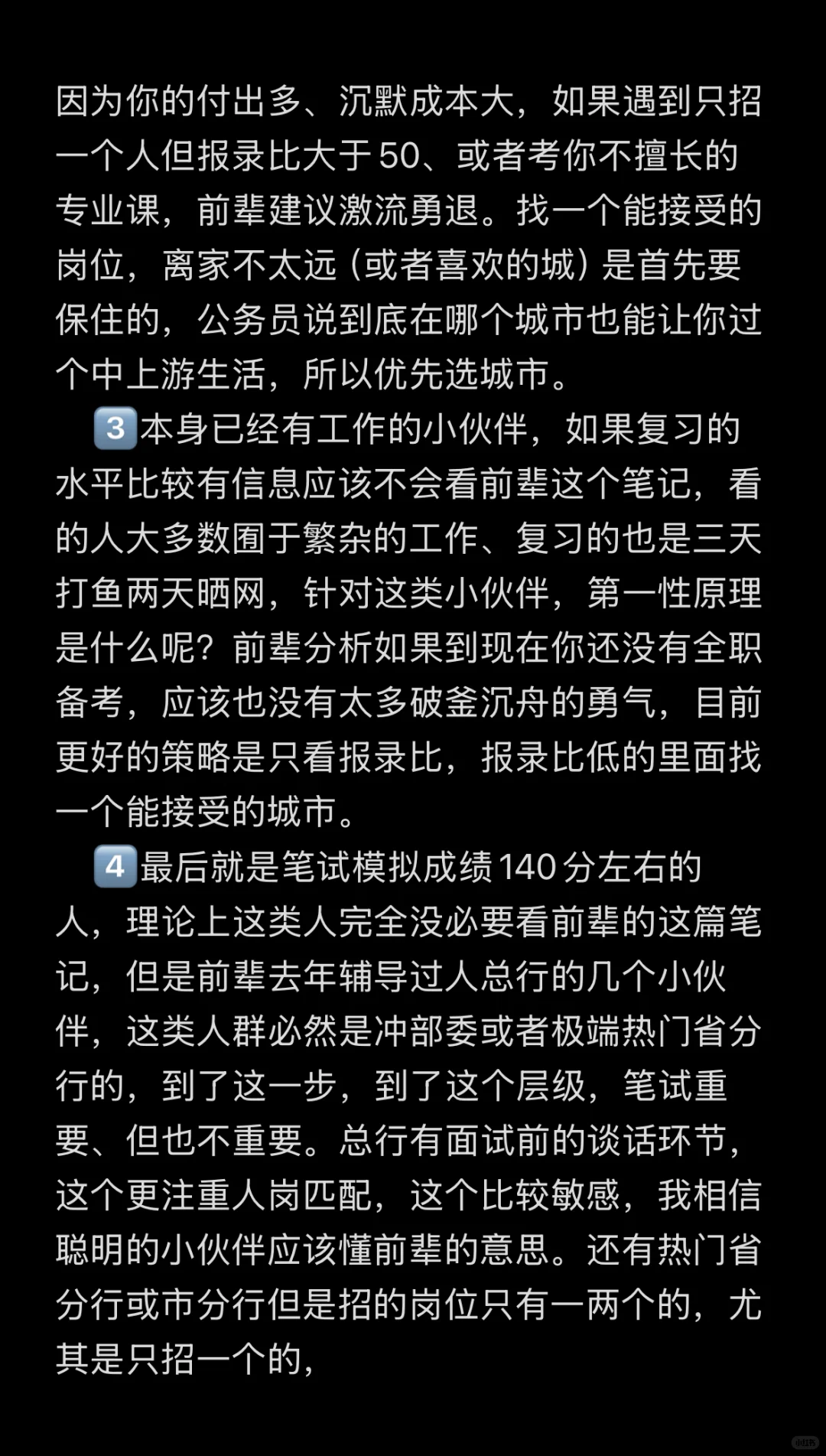 4️⃣最后就是笔试模拟成绩140分左右的人,理论上这类人完全没必要看前辈的这篇笔记,但是前辈去年辅导过人总行的几个小伙伴,这类人群必然是冲部委或者极端热门省分行的,到了这一步,到了这个层级,笔试重要、但也不重要。总行有面试前的谈话环节,这个更注重人岗匹配,这个比较敏感,我相信…..其他详见上图。