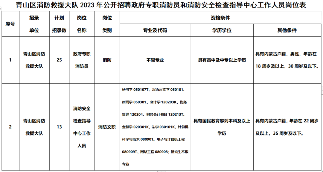 2.具体学历、专业、年龄及岗位要求详见《青山区消防救援大队2023年公开招聘政府专职消防员和消防安全检查指导中心工作人员岗位表》(附件1)。