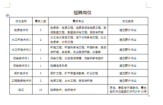 3.具备与招聘岗位一致的专业、技能条件,具备适应野外地勘工作要求的身体条件。