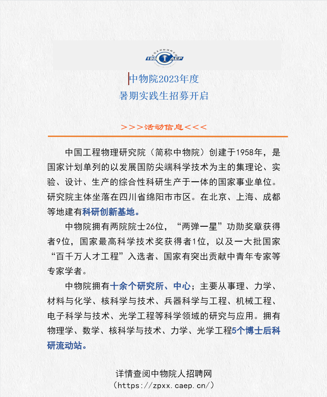 >招聘 | 中物院2023年度暑期实践生招募开启