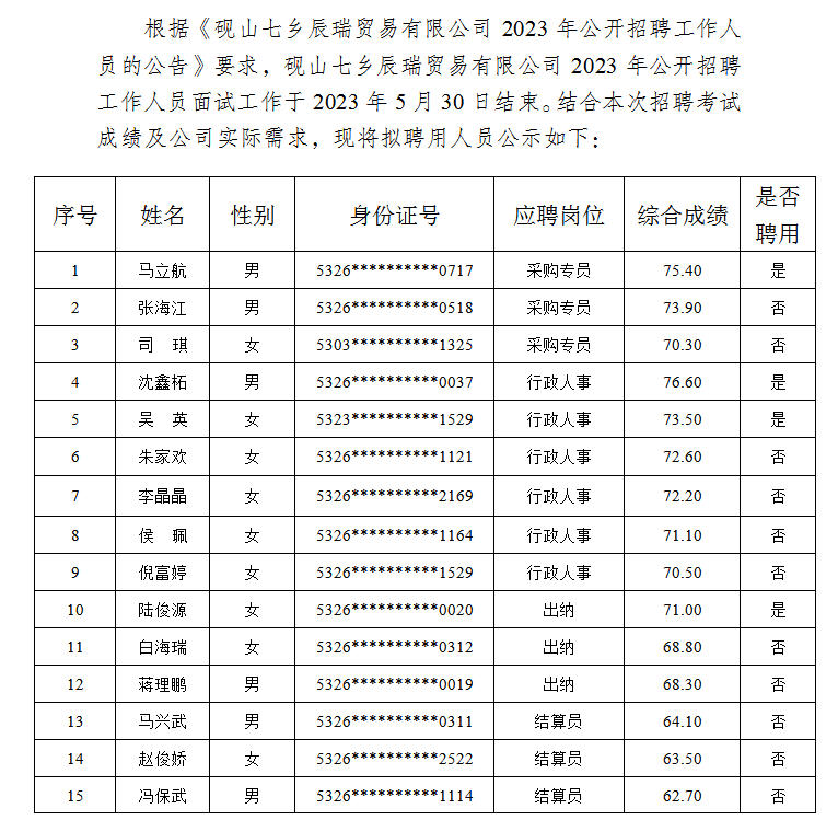>砚山七乡辰瑞贸易有限公司2023年公开招聘工作人员综合成绩公示