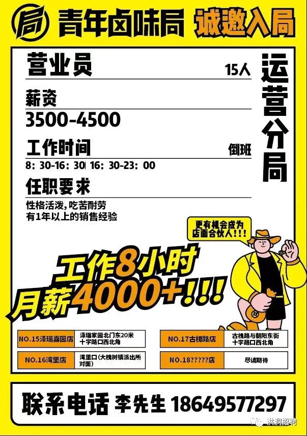 薪资:底薪5000加提成,能力越高工资越高, 工作认真,有野心想赚钱的欢迎加入!