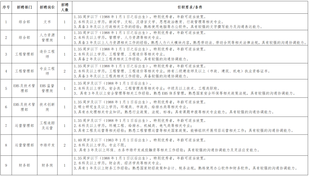 (7)大学本科毕业生年龄不超过35周岁(1987年6月15日以后出生),硕士研究生以上学历学位的毕业生年龄不超过40周岁(1982年6月15日以后出生),高技能人才年龄不超过40周岁(1982年6月15日以后出生)。点击查看更多招聘信息