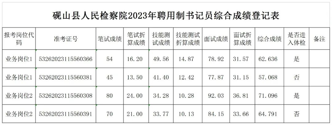 >砚山县人民检察院2023年公开招聘聘用制书记员综合成绩公告