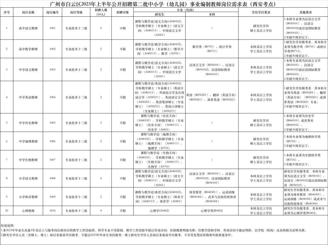 本次共招聘事业编制教师127名,具体岗位的招聘对象、岗位条件和人数详见《广州市白云区2023年上半年第二批公开招聘中小学(幼儿园)事业编制教师岗位需求表》(附件1-3)。