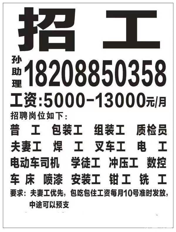 普工 焊工 叉车工 学徒工 类别:求职招聘-招聘-普工 五险一金加班补包住包吃年底双薪 区域:砚山县 地址:云南滇中智能产业园 5500-10000招聘:普工,焊工, 叉车工,电工,机修工,质检员,假期工,文员,电动车司机,操作工, 包装工,数控车床,喷漆,组装工,安装工 ,钳工,铣工,储备管理,学徒工数名 云南滇中智能,主要生产研发新能源汽车 ,汽车配件,新能源汽车锂电池,充电桩,电子电器,新建工厂面向社会招聘人才的加入 要求:身体健康,夫妻工优先可安排夫妻房,服从管理,无传染疾病,计时,计件都有,包吃包住,五险一金,晋升空间大,能力强的可做技术员,带班,做管理,《企业管理,电气自动化,计算机,数控,汽车,电工,机修工》有以上专业的中技或者大学生重点培养,应届生假期工均可安排,每月10号准时发放工资,上班7天可预支工资 182 0885 0358孙姐,企业直招,中介勿扰