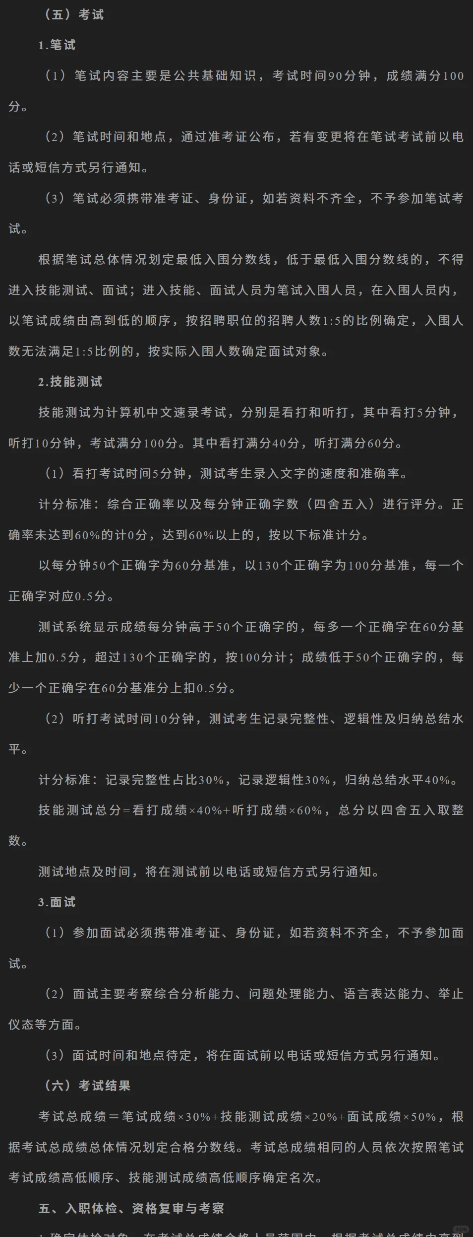 计分标准:记录完整性占比30%,记录逻辑性30%,归纳总结水平40%。技能测试总分=看打成绩×40%+听打成绩×60%,总分以四舍五入取整数