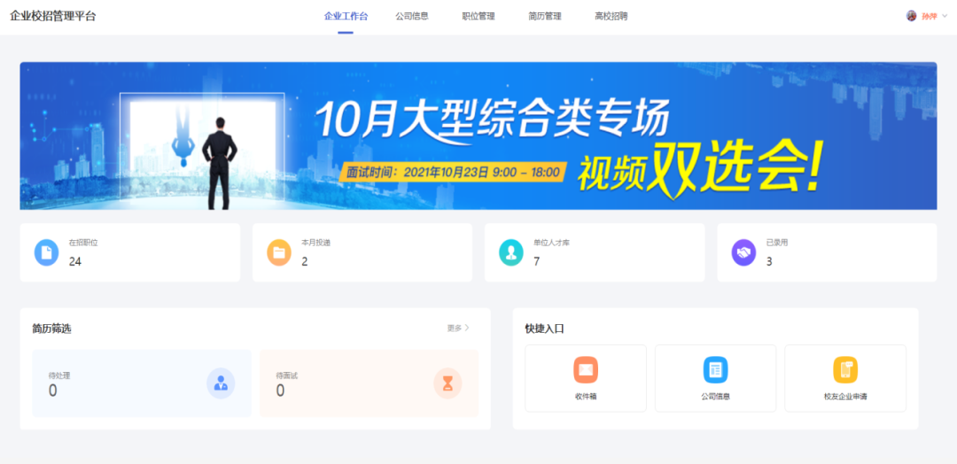 学生可通过双选会模块看到企业发布的职位信息,进行在线投递,投递的简历会在【简历管理】中显示。企业即可进行后续招聘流程。