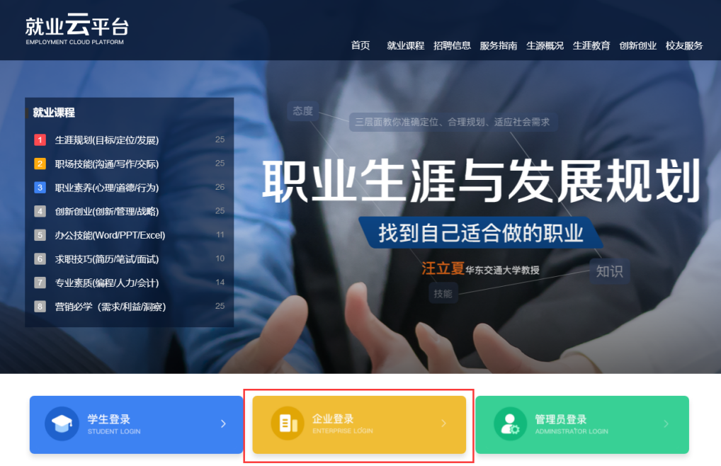 (1) 打开启雅就业云平台网址(https://dscloudbysfw.mh.chaoxing.com/),界面如下图所示。点击“企业登录”进入企业登录 / 注册页面。