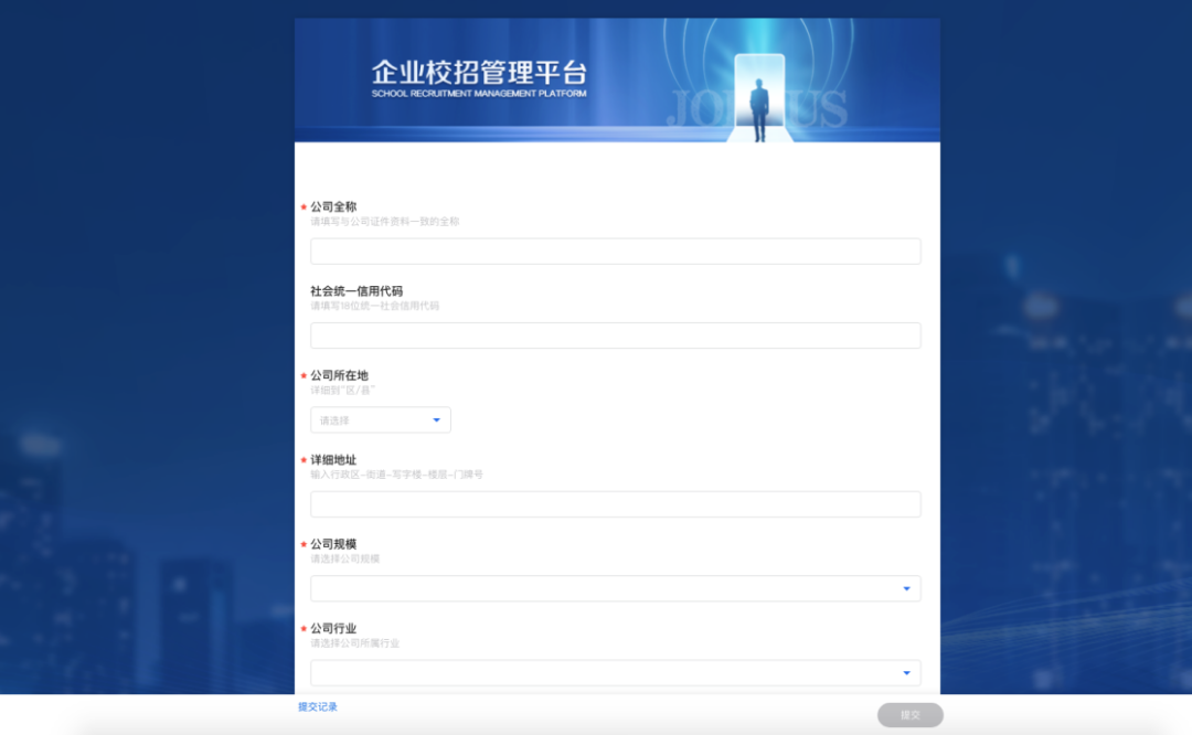 ● 未入驻企业登录后,系统会自动弹出入驻企业信息填报页面。企业信息填写完毕后,点击【提交】即可完成入驻申请。提交后,企业即可进入企业管理后台。