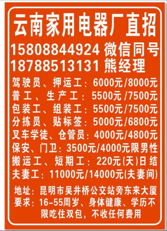 云南家用电器厂新分厂开业工,特招以下贤士加盟发展,