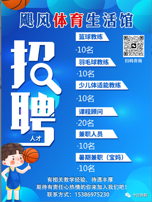 【招聘】飓风体育生活馆招聘教练誠聘篮球教练10名☄羽毛球教练10名?暑假短期工10名、课程顾问20名、篮球助教20名。有相关教学经验、待遇丰厚、期待有责任心热情的你来加入我们吧!联系方式:15386975230 15333572945