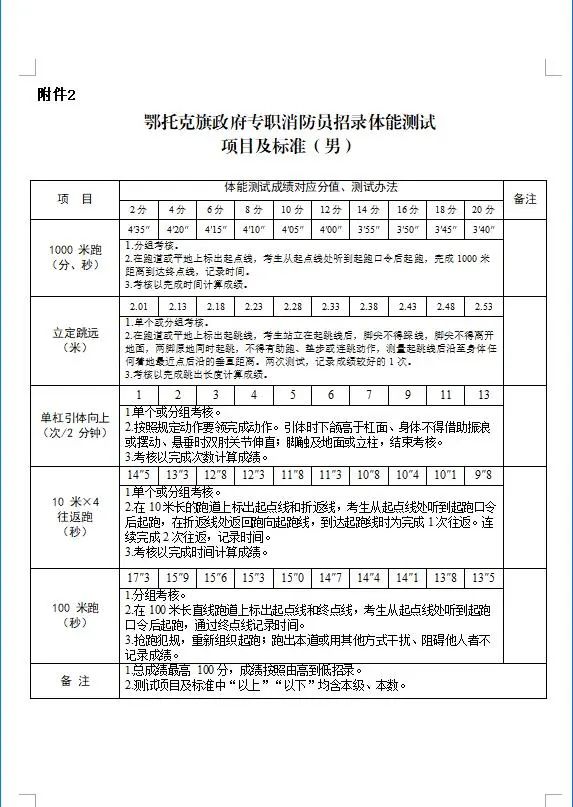 体能测试实行量化评分,按照《专职消防员招录体能测试、岗位适应性测试项目及标准》(附件2)执行,五项体能测试每项满分20分,共计100分。参加体能测试人员要在考前签订《鄂托克旗消防救援大队政府专职消防员招录体能测试承诺书》(附件3)。测试结束后按人员综合成绩排名顺序,按一定比例确定人选。如单项多人达到满分以上成绩,按照项目的分类,依据耗时短、距离长、数量多等原则进行排名。测试分组由现场抽签决定,全程录像拍摄,当场公布成绩。
