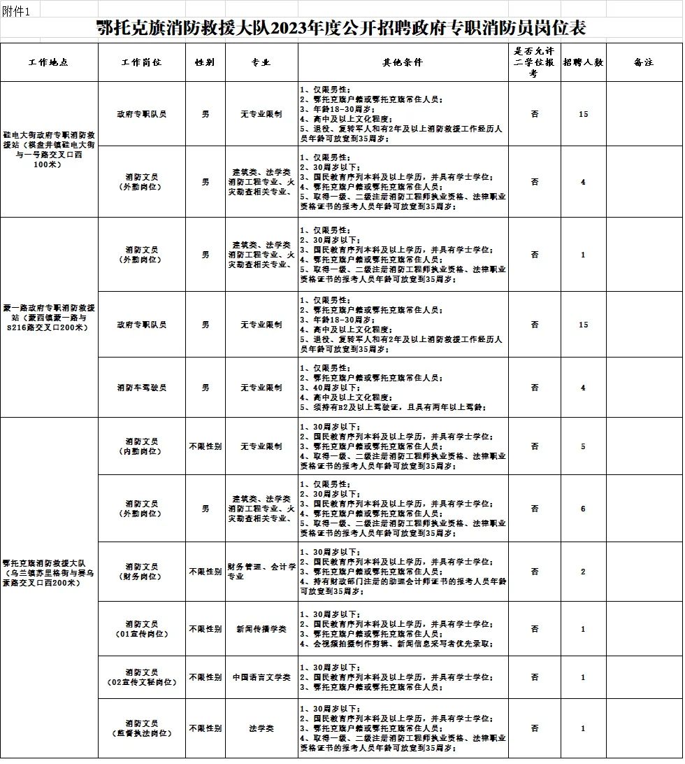 乌兰镇16人,均为消防文员;棋盘井镇共计19人,其中政府专职消防队员15人,消防文员4人;蒙西镇共计20人,其中政府专职消防队员15人,消防车驾驶员4人,消防文员1人;具体岗位要求详见《鄂托克旗消防救援大队2023年度公开招聘政府专职消防员岗位信息表》(附件1)。
