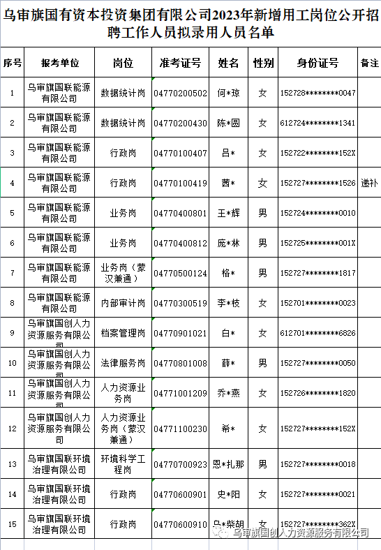 附件:乌审旗国有资本投资集团有限公司2023年新增用工岗位公开招聘工作人员拟录用人员名单