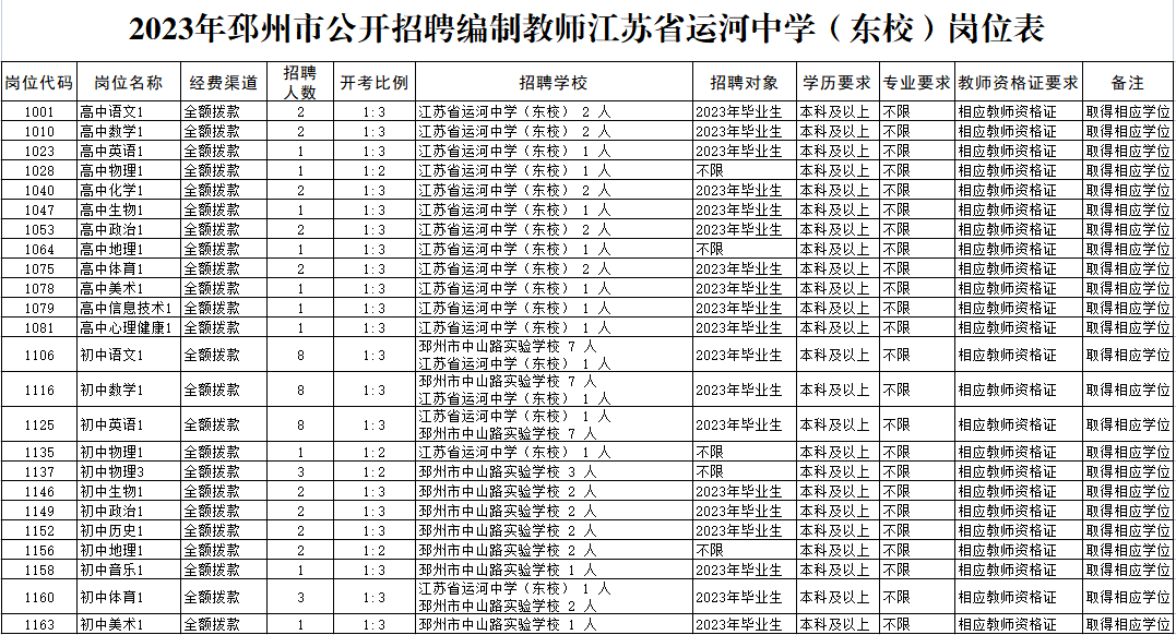 为促进教育事业发展,优化人员结构,加强教师队伍建设,根据《事业单位人事管理条例》《关于进一步做好全省中小学校新进教师公开招聘工作的意见》《江苏省事业单位公开招聘人员办法》等有关规定,邳州市决定面向社会公开招聘编制教师626名,涉及江苏省运河中学(东校)58个教师岗位,其中高中部17人,初中部5人,文和校区36人。