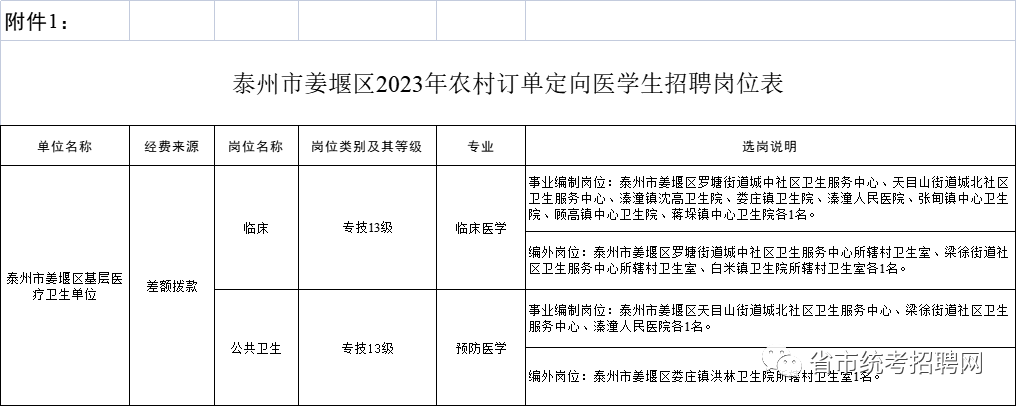 招聘单位、岗位、计划详见《泰州市姜堰区2023年农村订单定向医学生招聘岗位表》(附件1,以下简称《岗位表》)。