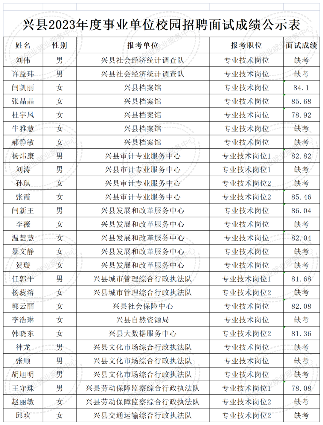 详见附件1《兴县2023年度事业单位校园招聘面试成绩公示表》。