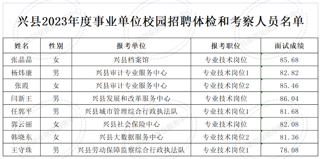 按照《兴县2023年度事业单位校园招聘实施方案》,经兴县2023年度事业单位校园招聘工作领导组研究,现将面试成绩及体检考察工作等有关事项公告如下: