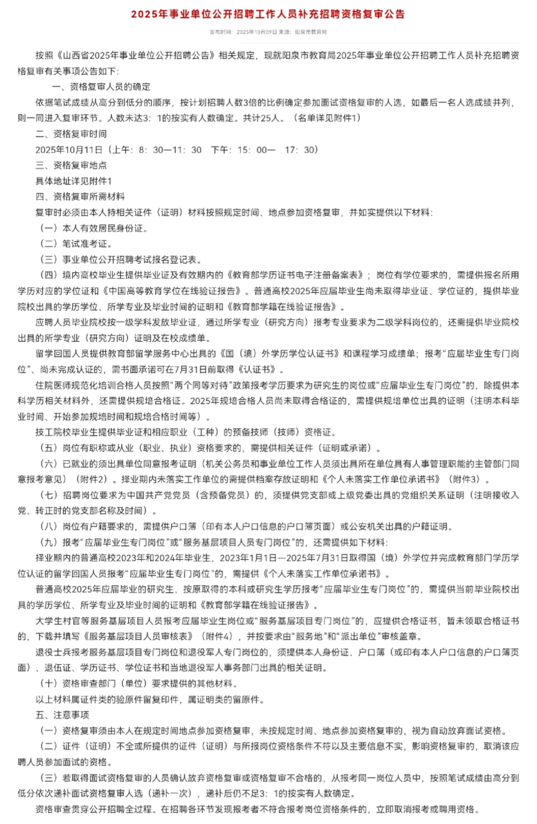 阳泉市教育局2025年事业单位公开招聘工作人员补充招聘资格复审公告