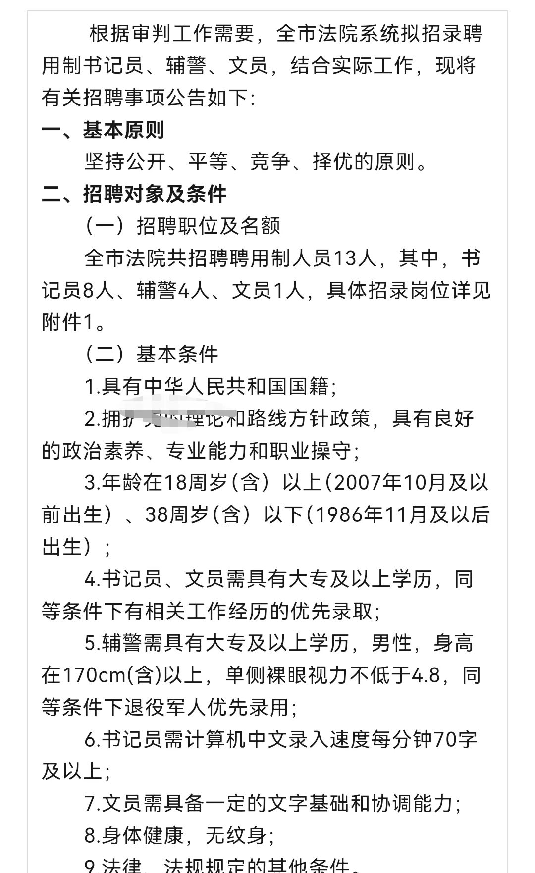 全市法院共招聘聘用制人员13人,其中,书记员8人、辅警4人、文员1人,具体招录岗位详见附件1。