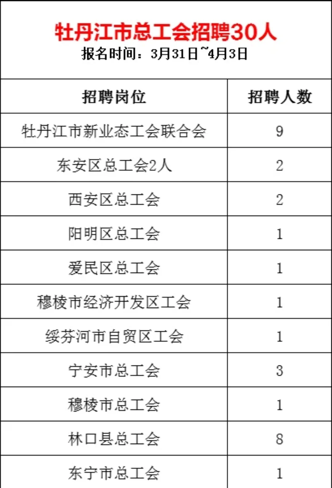 牡丹江市新业态工会联合会9人(含法律援助管理岗2人);穆