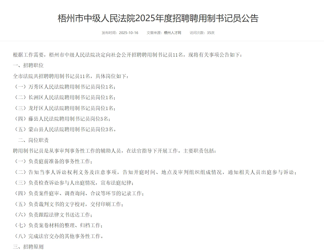 招考详情:万秀区人民法院聘用制书记员岗位1名;长洲区人民法院聘用制书记员岗位1名; 龙圩区人民法院聘用制书记员岗位1名; 藤县人民法院聘用制书记员岗位5名;蒙山县人民法院聘用制书记员岗位3名。