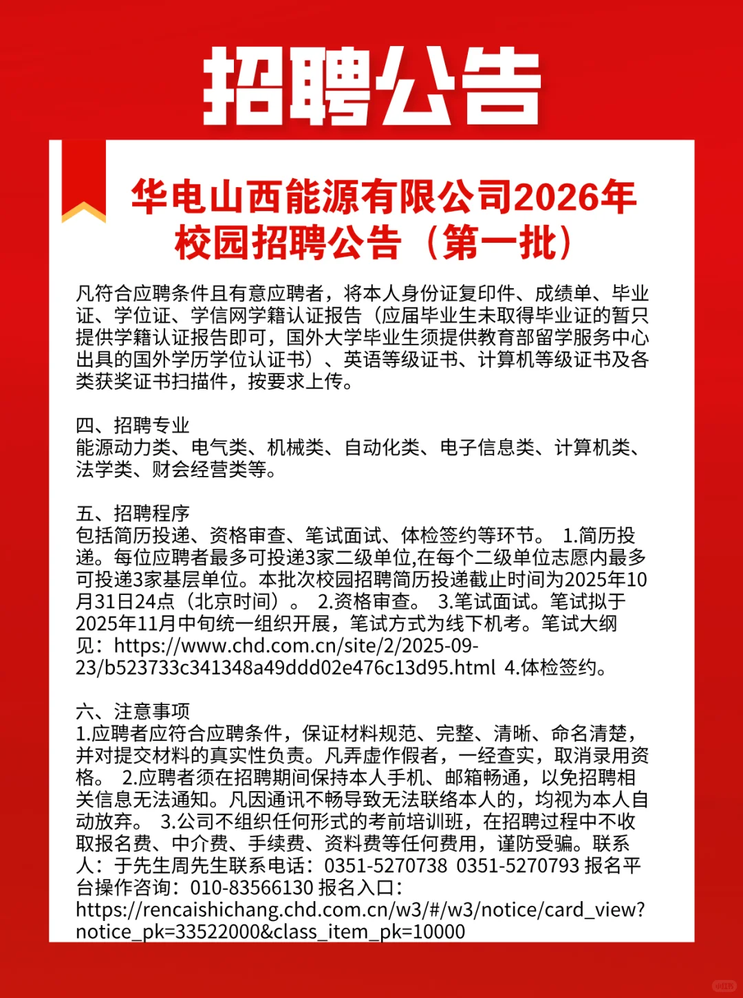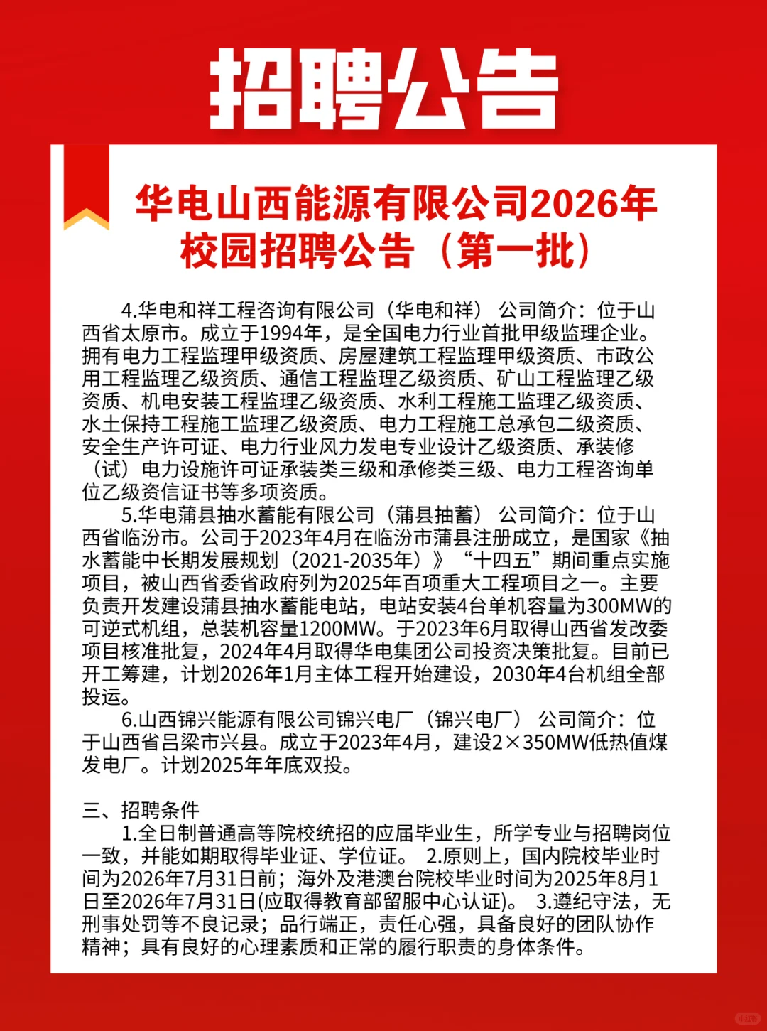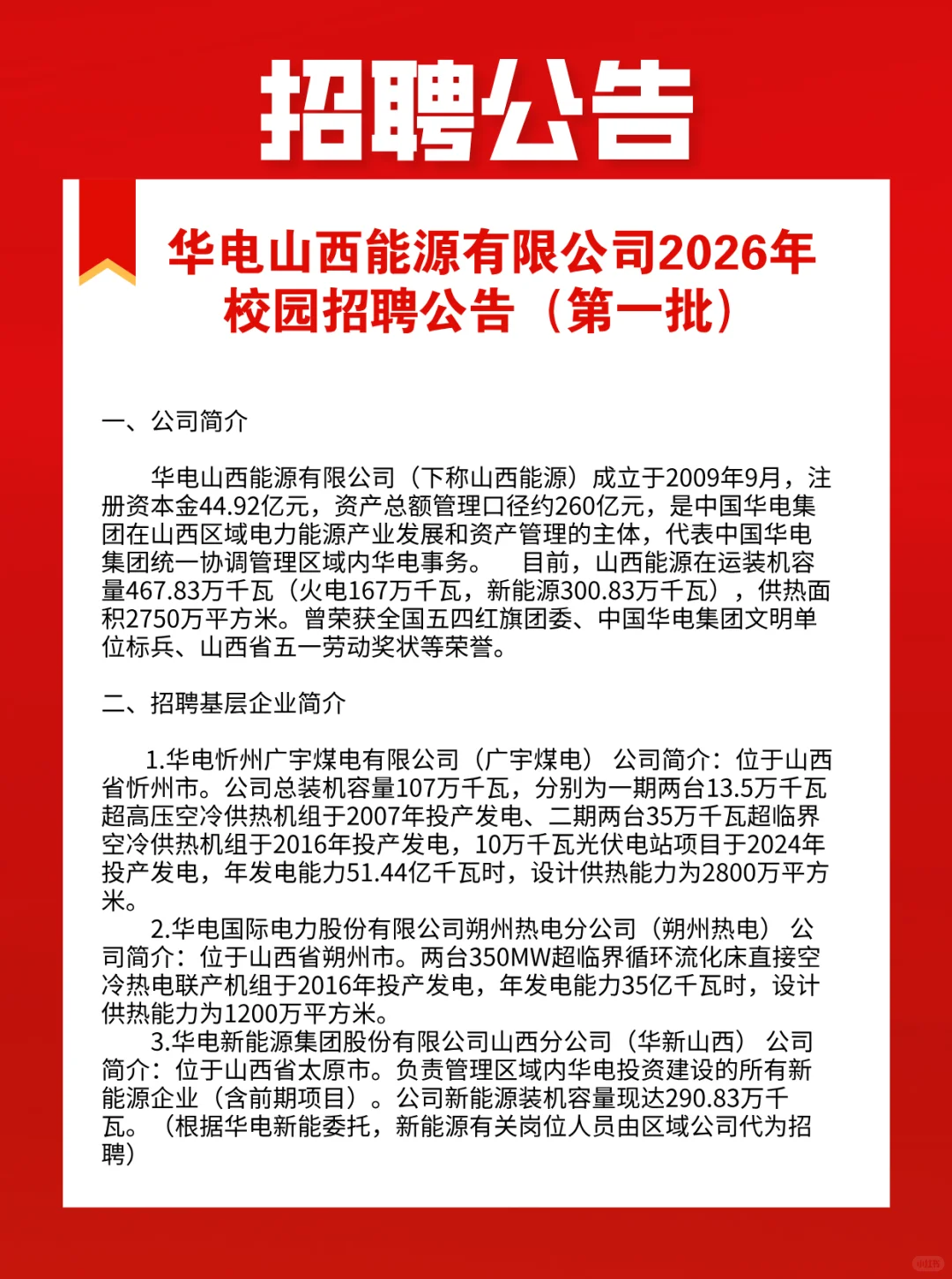 华电山西能源有限公司2026年校园招聘公告(第一批)