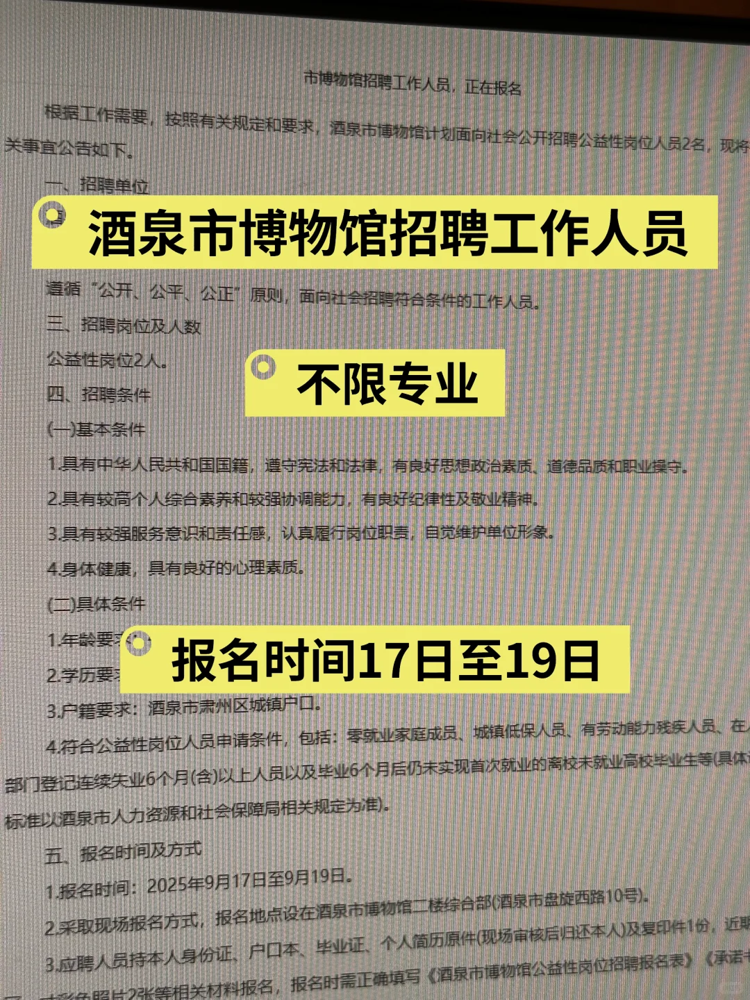 酒泉市博物馆发布招聘,共招2人,不限专业