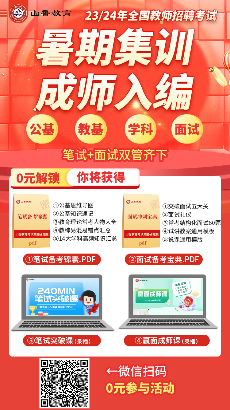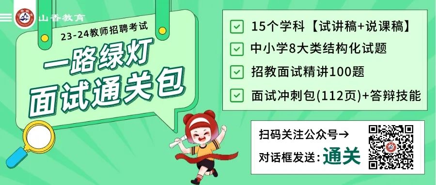 ▲ 点击蓝字关注,后台回复通关获取面试礼包 笔试高峰期已过 准备面试的同学快快看过来 面试专项提分,你一定用得上 每天两道结构化 招教面试必拿下 ![]() Jie Gou Hua 中小学结构化试题 — 职业认知与岗位匹配类 — ![]() NO.99 你认为一个优秀的教师应该具备哪些素质? · · · 思考一下,再看答案 ![]() · · · 滑动查看参考答案↕ ![]() ![]() NO.100 你为什么想成为一名教师? · · · 思考一下,再看答案 ![]() · · · 滑动查看参考答案↕ ![]() 学完记得留言“打卡”喔~ 留下努力学习的印记! ![]() *如果你对当地考情有任何疑问,或者备考过程中遇到了问题,都可以扫描下方二维码,会有专业的老师为你答疑解惑喔~ 温馨提醒 更多备考福利 ![]() 2023-08-20 ![]() 2023-08-19 ![]() 2023-08-18 ![]() ![]() ↓点击阅读原文 为您答疑解惑 ![]() ![]() |