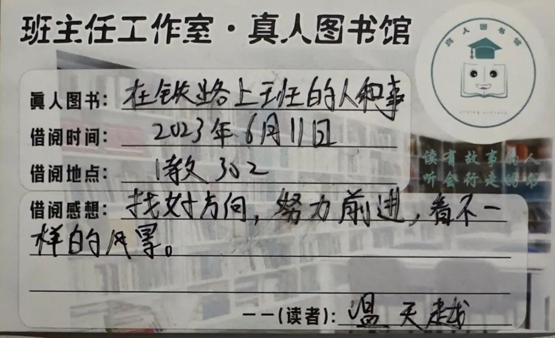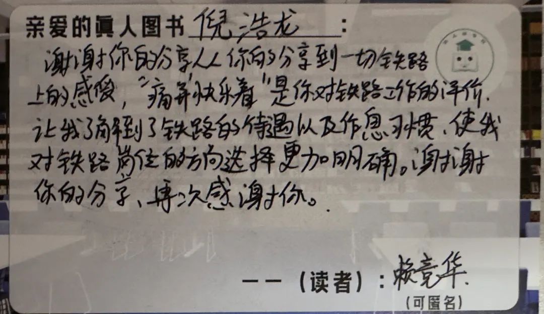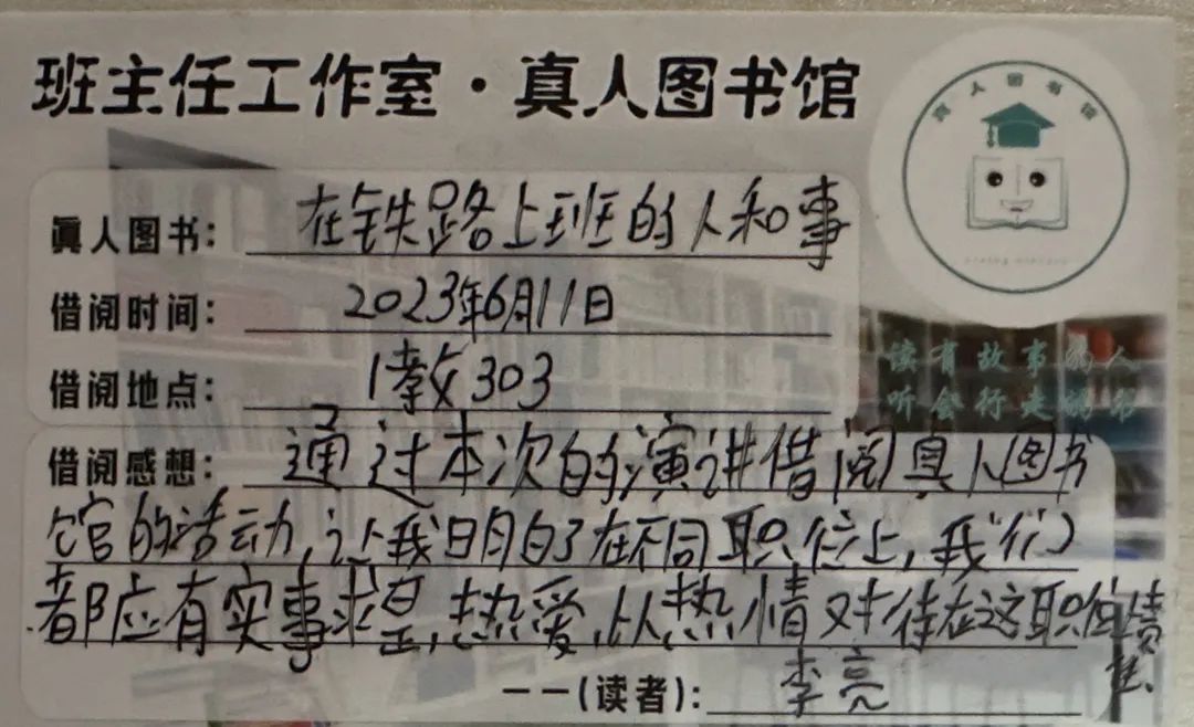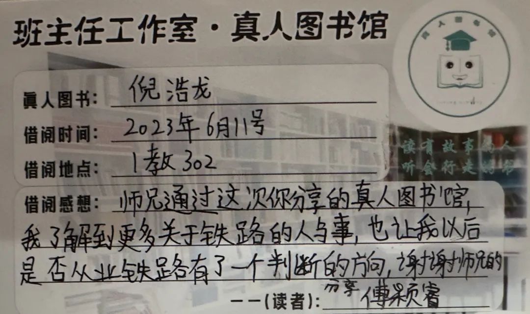对于真人图书的分享,读者们更加明确作为一名铁路学子接下来的路该怎么走,非常感谢真人图书的分享,并在借阅卡上写下了本次的借阅感想以及对真人图书想说的话。