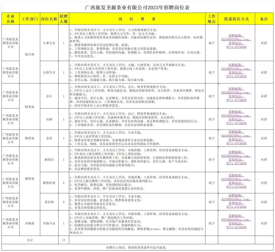 广西旅发圣源茶业有限公司公开招聘17名员工(详见附件1)。
