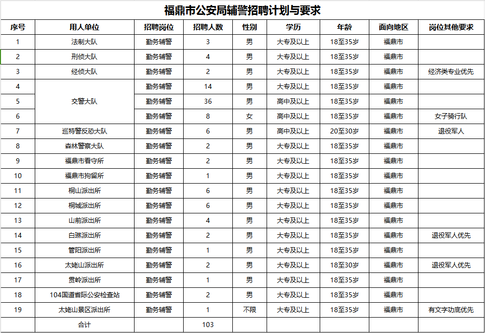 辅警103名(其中:男性94名,女性8名,男女不限1名),具体招聘岗位与要求详见附件。