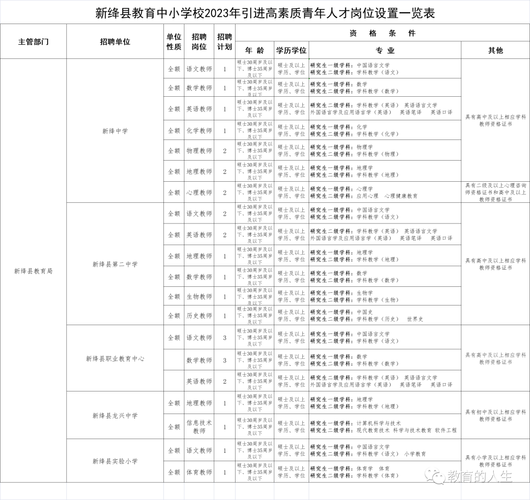 2023年教育中小学校通过公开招聘引进高素质青年人才共计30人。具体招聘岗位及专业要求等见附件《新绛县教育中小学校2023年引进高素质青年人才岗位设置一览表》。