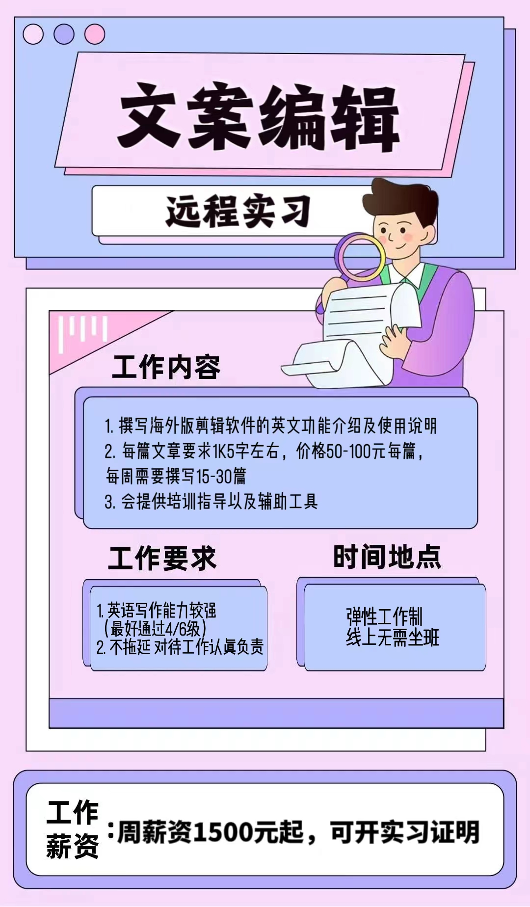 >兼职 丨 每周薪资1500元起,可开实习证明!招聘文案编辑,有工具辅助!
