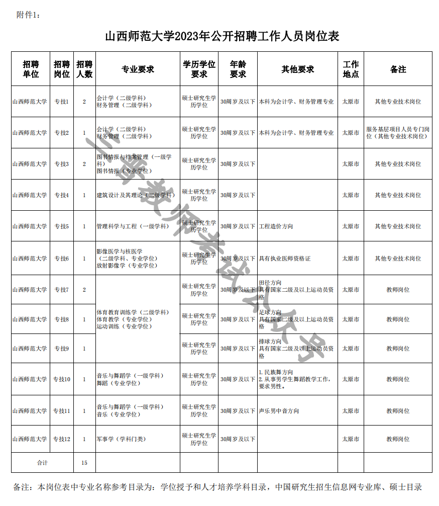 山西师范大学创建于1958年,建校64年来,学校秉承师范教育的优良传统,不断深化教师教育改革,现已发展成为一所学科门类齐全、本硕博培养体系完备、办学特色鲜明的省属重点大学,是山西省基础教育师资培养的重要基地,山西省“双一流”学科建设高校,山西省高等教育“1331工程”提质增效重点建设院校,目前正朝着全面建成特色鲜明的综合性一流师范大学目标昂首迈进。为进一步加强我校教师队伍建设,切实吸引一批学历层次高、专业知识强急需紧缺的人才充实到教师队伍中,根据工作需要,学校面向社会公开招聘工作人员,现就有关事项公告如下:山西师范大学2023年公开招聘工作人员15名,均为专业技术岗位。招聘岗位所需的具体条件以《山西师范大学2023年公开招聘工作人员岗位表》(附件1)的要求为准。符合招聘条件和岗位具体要求的高校毕业生(不含2023年毕业的委培、定向生)、服务基层项目人员。(五)具备岗位所需的学历学位、专业或技能要求(本科、硕士阶段均应取得学历学位证书)。(六)年龄不超过30周岁(1992年8月14日以后出生)。按照国家和我省有关政策规定,港澳地区的中国公民和台湾同胞在事业单位公开招聘中享有公平竞争权利,可应聘到内地事业单位就业,应聘人员须具备招聘岗位所需的专业或技能等相应条件。参加“大学生志愿服务西部计划”(含晋西北计划)和参加我省“选聘大学生村官工作”(不含2018年以后录用的选调生)、“农村义务教育阶段学校教师特设岗位计划”、“三支一扶”计划、“农业技术推广服务特设岗位计划”等服务期满、考核合格的人员,可报考“服务基层项目人员专门岗位”。在军队服役5年(含)以上高校毕业生退役军人可按服务基层项目人员对待,报考“服务基层项目人员专门岗位”。1.现役军人和在读的非应届毕业生(其中,非2023年应届毕业的研究生不得以原取得的研究生学历、学位证书报考),不能报考;2.因犯罪受过刑事处罚的、被开除中国共产党党籍和公职的;在立案审查期间或未解除党纪、政纪处分的人员,不能报考;3.各级公务员招考和事业单位招聘中被认定有舞弊等严重违反考录、招聘纪律行为的人员,不能报考;4.试用期内的公务员(参照公务员法管理事业单位工作人员)和试用期内的事业单位工作人员,不能报考;5.招聘为事业单位工作人员有服务年限规定且服务期未满的,不得报考;6.被依法列为失信联合惩戒对象以及法律、法规规定不符合本次公开招聘要求的人员,不能报考;应聘者在报名之后、聘用之前已成为试用期内的公务员(参照公务员法管理事业单位工作人员)或已被聘用为事业单位工作人员的,不予聘用。招聘条件或岗位要求的辞退、现役、试(聘)用期、服务期、户籍、各类从业(职业、执业)资格证书等的截止时间,除岗位有明确要求外,均为公告发布之日。1.报名时间:2023年8月22日至2023年8月24日 上午9:00-11:30 下午14:30—17:003.报名地点:山西省太原市小店区太榆路339号山西师范大学南区实验楼一层报告厅。(请从学校南校区东门持报名材料进入)(1)《山西师范大学2023年公开招聘工作人员报名登记表》(附件2)纸质版(本人手写签名)。报名表中所填写的专业应当与报考者本人取得高校毕业证上所载明的专业一致。如招聘岗位专业要求为二级学科专业,毕业学校按照一级学科发放毕业证的,须如实填写毕业证所载一级学科名称,并提供毕业学校相关管理部门出具的所学具体专业的证明和学习成绩单原件及复印件。(4)留学人员须提供教育部留学服务中心出具的国(境)外学历学位认证书和硕士阶段课程学习成绩单原件、复印件及具有翻译资质的机构出具的翻译件。(5)已就业的还须出具单位同意报考证明原件及复印件(机关公务员和事业单位工作人员须出具所在单位具有人事管理职能的主管部门同意报考意见)。(6)招聘岗位所要求的其他材料原件及复印件。专业方向有要求的,须提供毕业院校出具的所学具体专业方向证明和硕士阶段学习成绩单(加盖学校相关管理部门公章);招聘岗位有资格证书要求的,需提供相关资格证书原件及复印件。(7)大学生村官等服务基层项目人员报考“服务基层项目专门岗位”的,应提供合格证书,暂未领取合格证书的,下载并填写《服务基层项目人员审核表》(附件3),由服务所在地和市以上派出主管部门加盖公章确认(大学生村官由市、县两级组织部门审核盖章。“教师特岗计划”项目人员需在“服务地审核意见”栏填写服务地县级教育行政部门同意报考意见并盖章。“西部计划”项目人员由团省委盖章。“农业技术推广服务特设岗位”计划项目人员由服务地县级人社局和市农委审核盖章。“三支一扶”计划项目,需在“服务地审核意见”栏填写由服务地县级人社行政部门同意报考意见并盖章。)。退役士兵报考服务基层项目专门岗位的,须提供本人身份证、户口簿(或印有本人户口信息的户口簿页面)、退伍证、学历证书、学位证书和当地退役军人事务部门出具的相关证明。公开招聘工作领导组办公室组织对应聘者的招聘条件逐项进行审查。资格审查要责任到人,严格执行初审、复审二次审查办法和审查签字记录制度,确保资格审查客观、严谨、公正。取得国(境)外学历学位的应聘人员所学专业与招聘专业不一致时,由公开招聘工作领导组组织相应专家组(3-5
