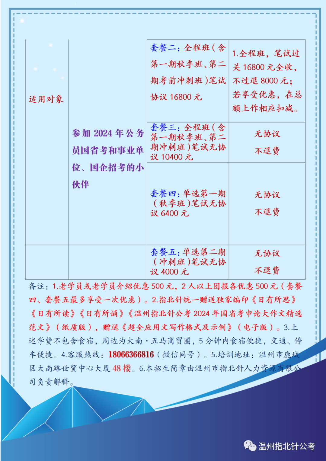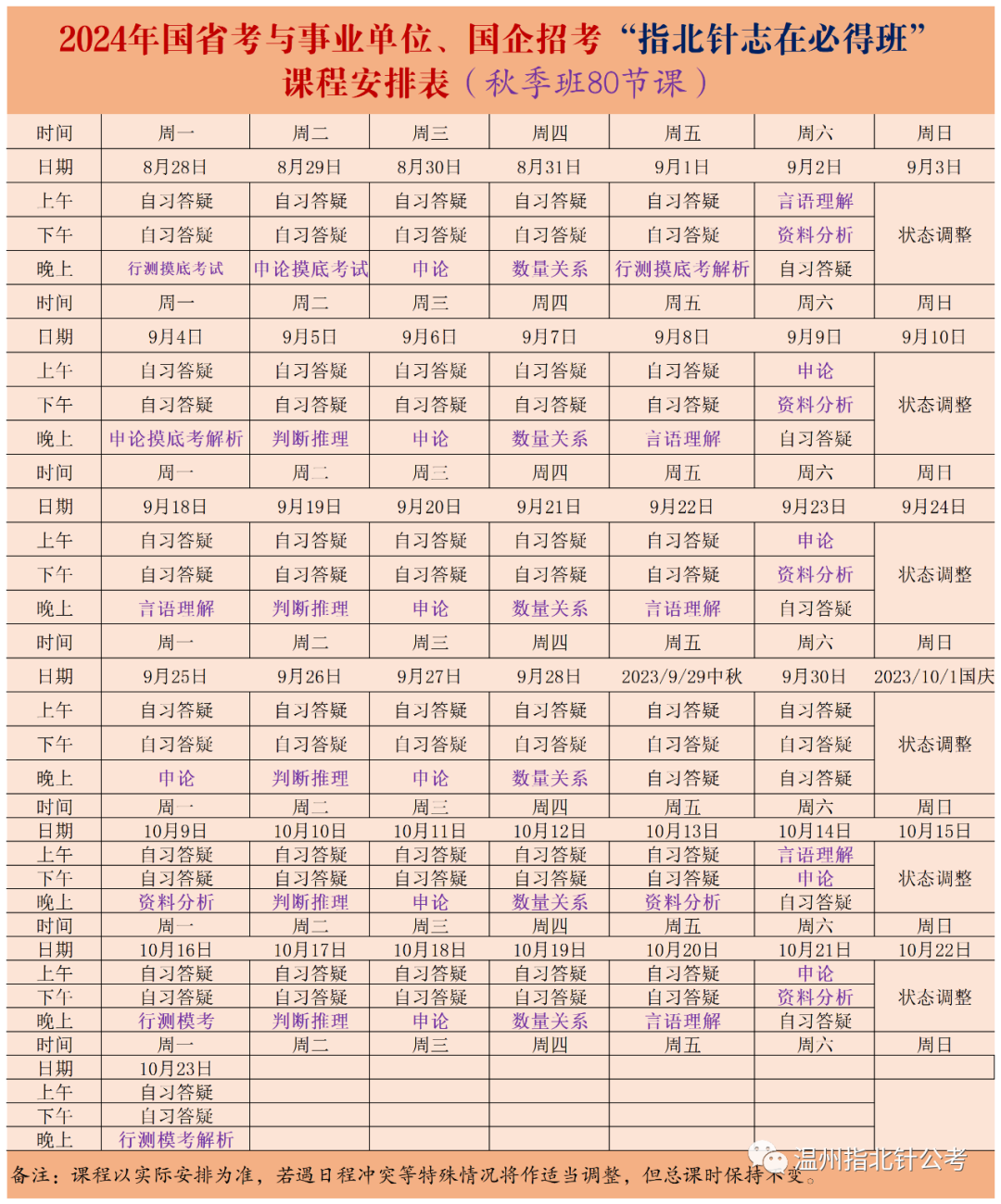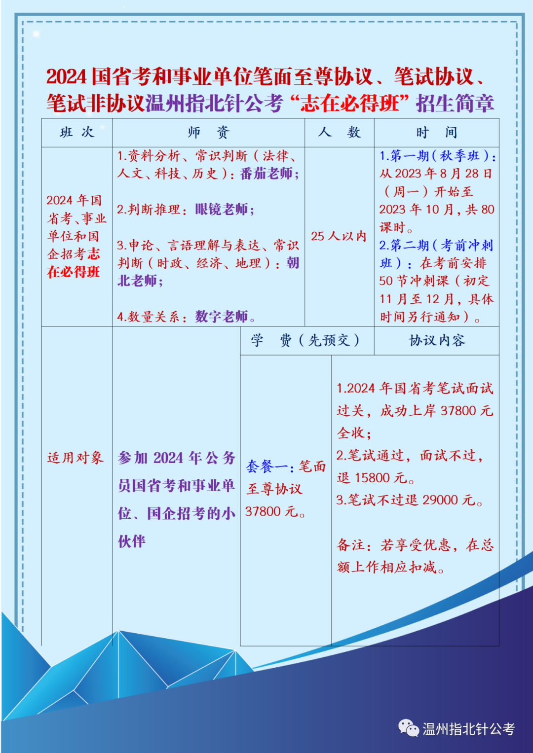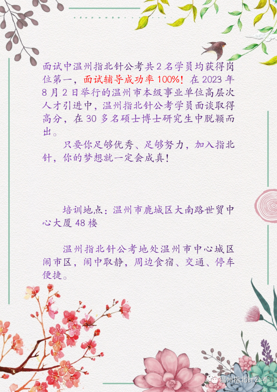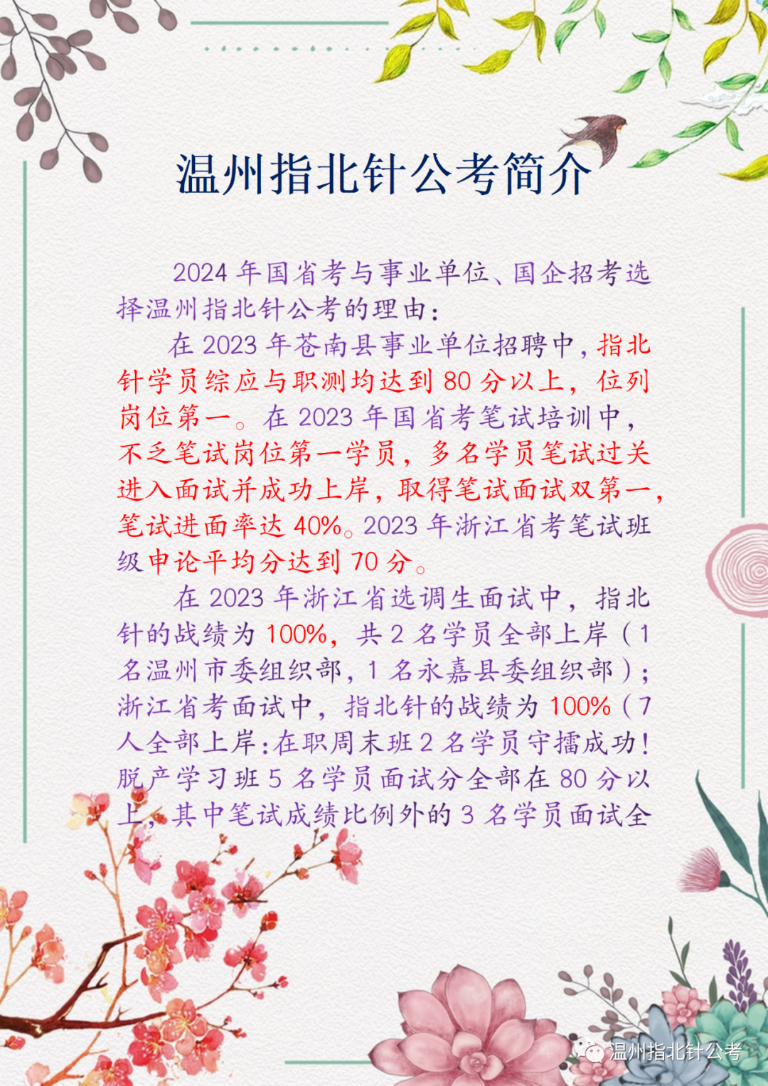 大家好!为迎接即将到来的2024年国省考与2023年下半年温州市瑞安、永嘉等地事业单位招考,温州指北针公考特举办“志在必得”笔试精小班,助推小伙伴提高笔试成绩,助力成功上岸!本期从8月28日开班,系统学习2024年国省考和事业单位招聘笔试内容,零基础可报,适合全脱产与在职小伙伴。