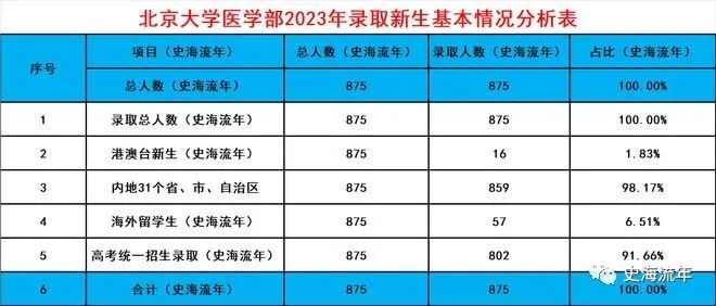 北京大学医学部2023年共录取875人,其中,港澳台本科生16人,占比1.83%。内地31个省、市、自治区共录取859人,占比98.17%。海外本科留学生共57人,占比6.51%。高考统一招生及提前批录取802人,占比91.66%。