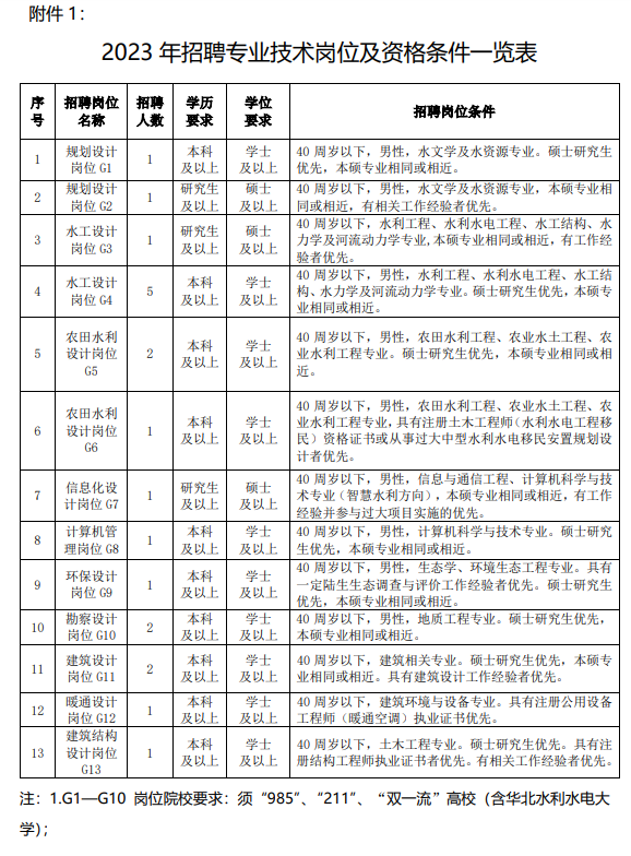 吉林省水利水电勘测设计研究院成立于1958年9月,隶属于吉林省水利厅,是一个以水利水电为主,具有独立法人资格的综合性甲级工程勘察、设计、咨询事业单位。吉林省高新技术企业,全国水利系统先进集体,全国水利文明单位。全院现有在职职工552人,正高级工程师(研究员)87人,高级工程师190人,工程师140人。现有水利部先进工作者1人,水利部青年拔尖人才1人,省突出贡献青年人才4人,省拔尖创新人才5人,吉林省经济技术创新能手1人。拥有工程勘察、设计、咨询等13项甲级资质,市政等4项乙级资质。设有规划、农田、水工结构、工程地质、工程测绘、水文、移民、水机、电气、金属结构、建筑、环保、环评、水保等37个专业。建院60多年来,先后为各级政府和国内外客户提供了近6000余项工程项目的勘察规划设计和咨询服务,500多项成果荣获国家、省、部和厅级以上奖励。为吉林省带来了显著的经济效益和社会效益,为吉林省国民经济的发展做出了重要贡献。详见《2023年招聘专业技术岗位及资格条件一览表》(附件1)