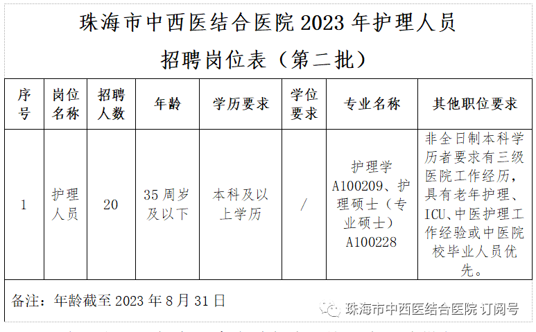 医护招聘温馨提示:珠海市中西医结合医院,2023年招聘护士20人,报名截止至2023年8月31日。欢迎人才加入我院!