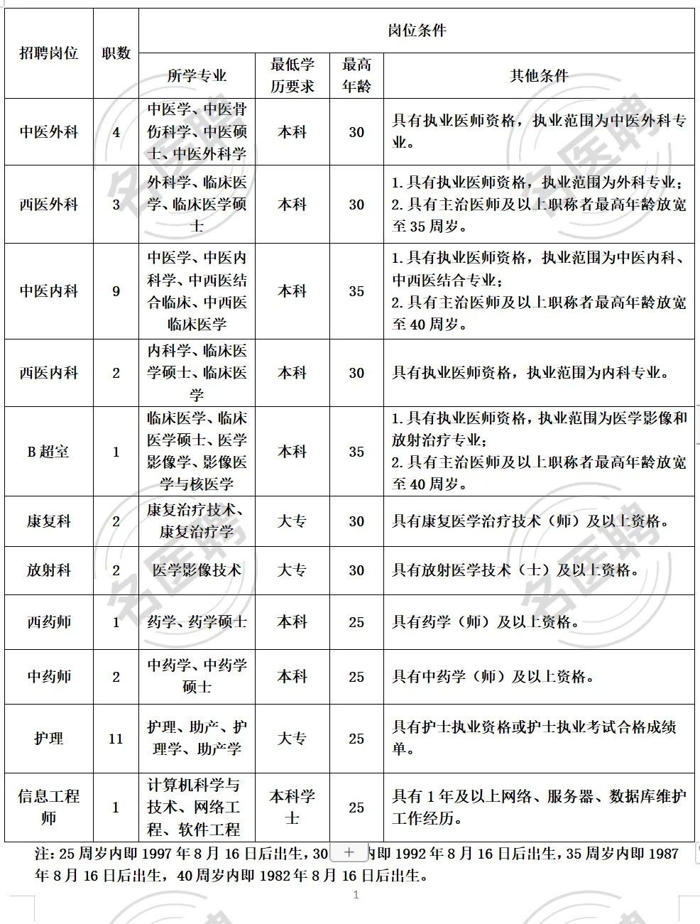 (五)学历(学位)证 、相关资格证、执业证取得时间截止至2023年8月16日。报考医师岗位的考生,如为2015年及以后毕业的普通高等学校本科毕业生,须于2023年12月31日前完成住院医师规范化培训(具有主治医师职称者不作此要求)。