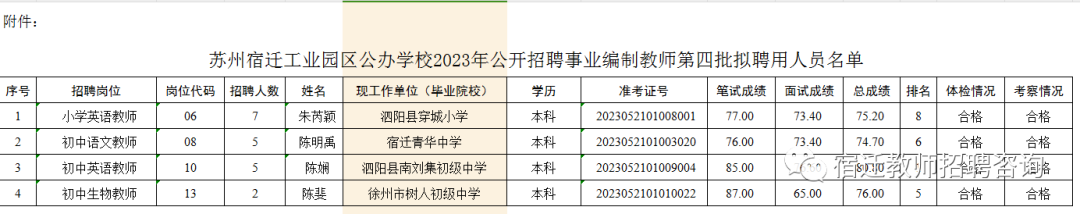 根据《苏州宿迁工业园区公办学校2023年公开招聘事业编制教师简章》,经过笔试、面试、体检、考察等程序,现将第四批拟聘用人员名单予以公示,名单详见附件。公示时间:2023年8月22日—8月28日,监督举报电话:0527—82861589。