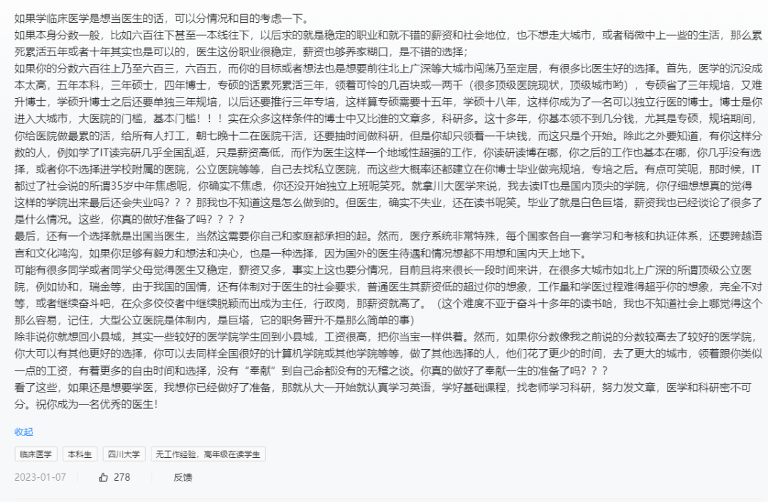 时下,许多高中毕业生可能会被医生这个职业的稳定和相对优厚的薪资所吸引。然而,作为一名医生,尤其是在中国的大城市如北京、上海、广州和深圳等地工作,情况远非看上去那么简单。选择学医不仅需要投入大量时间和精力,而且在完成学业后,繁重的工作压力和相对较低的薪资可能会让许多人感到意外和失望。此外,与IT等其他领域相比,医学可能不是那么灵活和有吸引力的选择。那么,学医到底值不值得呢?