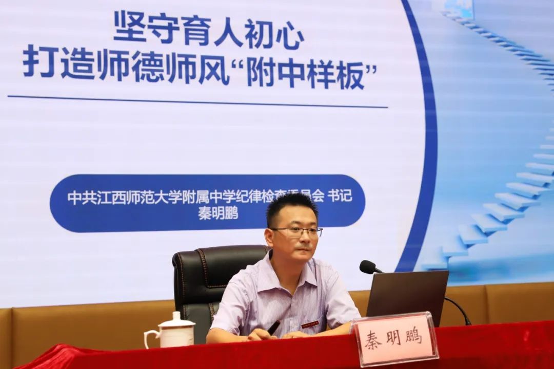 秦明鹏以《坚守教育初心,打造师德师风“附中样板”》为题,从“是什么”“为什么”“怎么做”三方面切入,详细阐述了新时代师德师风的内涵及要求、师德师风对教师职业发展的重要性,以及打造师德师风“附中样板”的具体途径,以此强调青年教师必须树立好附中风范,强化底线意识,扣好职业生涯的“第一粒扣子”。