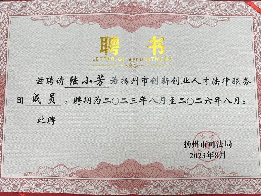 我所陆小芳律师获聘担任扬州市创新创业人才法律服务团成员。