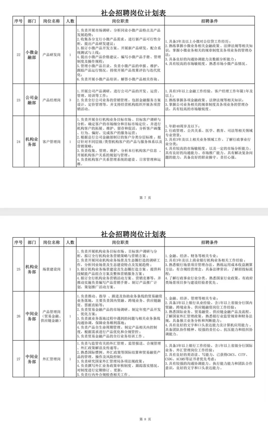 省级农商行总行零售金融部、乡村金融部、社区金融部、财富管理部.数字金融部、银行卡部、小微金融部、公司金融部、机构业务部、中间业务部(交易银行部)、金融市场部员工岗位38个。