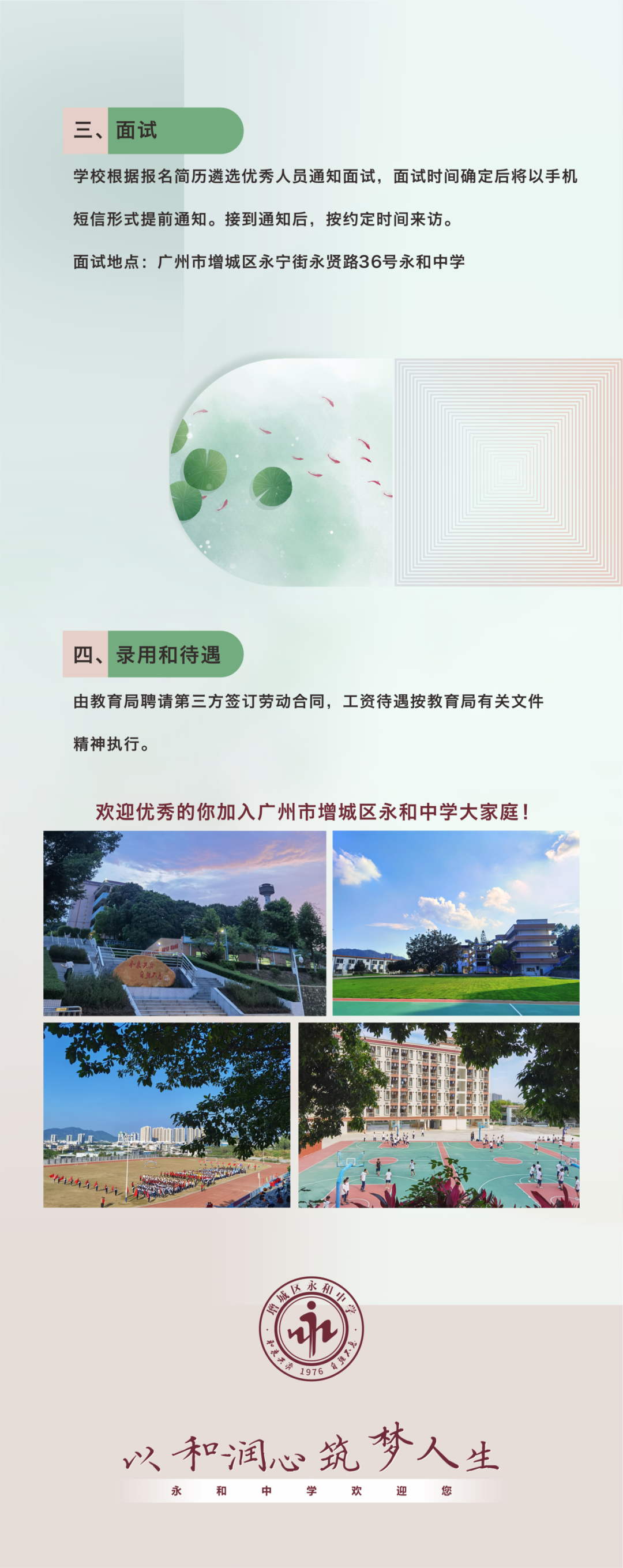 2. 新增历史职位报名截止时间2023年8月25日17:00 5.面试人员名单将于2023年8月25日19:00前在广州市第一一三中学微信公众号公布。广东实验中学荔湾学校创建于2019年9月,是荔湾区人民政府委托百年名校广东实验中学管理的一所九年制义务教育新样态公办学校,分为初中部、第一小学部、第二小学部、第三小学部、花地湾校区五个校区。学校环境优美,建设儒雅大气,设备设施配置一流。